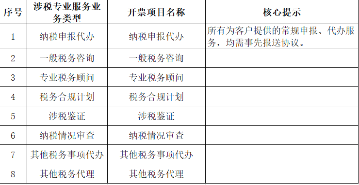 本次调整仅针对以下8类具有明确业务类型的涉税专业服务,开票时必须绑定协议: